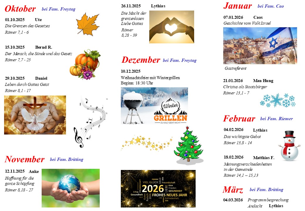 Wir behandeln verschiedene Bibeltexte, tauschen uns aus, sprechen über unsere Erfahrungen, über Alltag, Beruf, Familie. Ab und zu starten wir gemeinsame Unternehmungen.